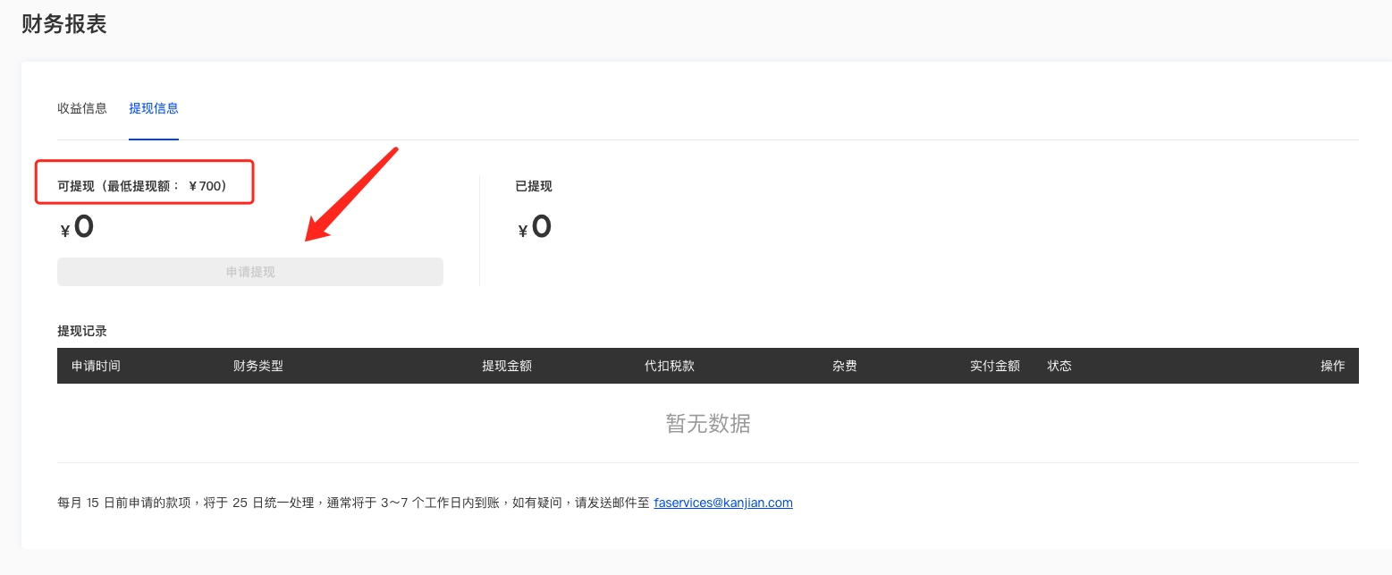 3)最低提现金额为:国内最低为“100”元 、国外最低为“700”元,达到指定的金额后,点击“申请提现”则会发起体现申请↓